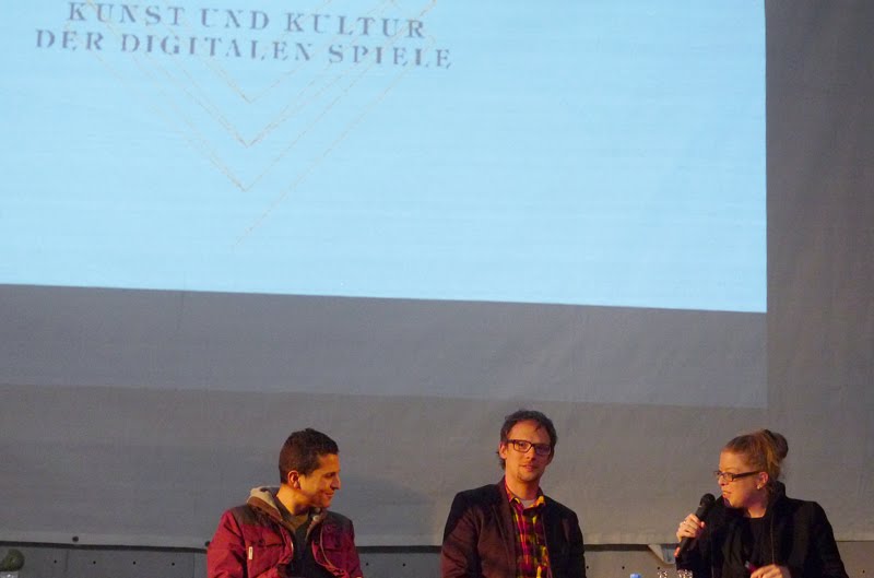 Inke Arns unterhält ihre Gesprächspartner - hier links Ibrahim Mazari von Turtle Entertainment und Thomas Lindemann, Redakteur "Die Welt"